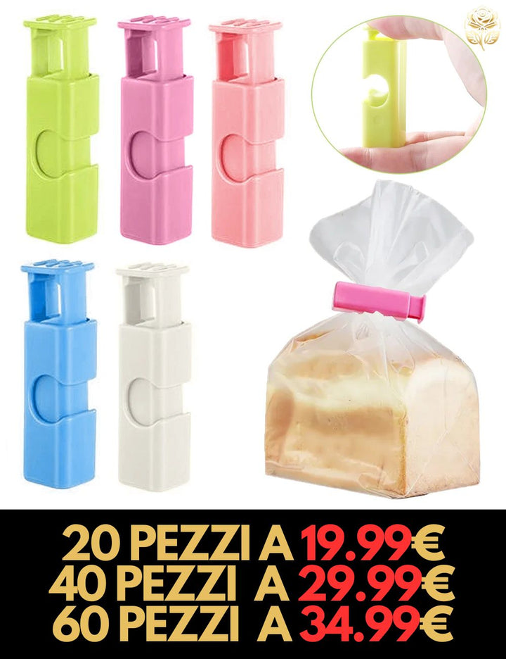 Supporti per chiudere i sacchetti alimentari.I supporti sono contenuti in una busta di plastica e sono realizzati in due misure. Sono venti pezzi.Sono facilissimi da utilizzare, basta aprirli, mettere in mezzo il sacchetto da sigillare e chiudere il supporto, il quale ha una struttura tale che consente una chiusura ermetica, troviamo due misure in maniera tale da poter essere utili sia per confezioni più piccole che più ampie, senza contare che possono utilizzarlo anche per i classici sacchetti di plastica e non soltanto per confezioni di cibo già pronto, come ad esempio patatine nel sacco.La mia esperienza col prodotto è positiva, lo trovo molto interessante per i popcorn, ne sono molto golosa, ma non riesco mai a finire l'intero pacco, e quando restano aperti diventano gommosi, motivo per cui trovo comodissime queste chiusure, che preservano meglio il prodotto.Sono comodi anche per la pasta, se non vogliamo trasferirla subito in un barattolo e lasciarla nella busta originale.L'uso è semplicissimo e sono abbastanza robusti, chiudono i sacchi in modo ermetico e senza fuoriuscite.Sono realizzati interamente in una plastica sufficientemente solida.CONFEZIONE: 4/5MATERIALI: 4,5/5MANIFATTURA: 4,5/5UTILIZZO: 5/5ESTETICA: 4/5PUNTO FORTE: chiudono ermeticamente i sacchiPUNTO DEBOLE: nessuno.